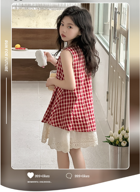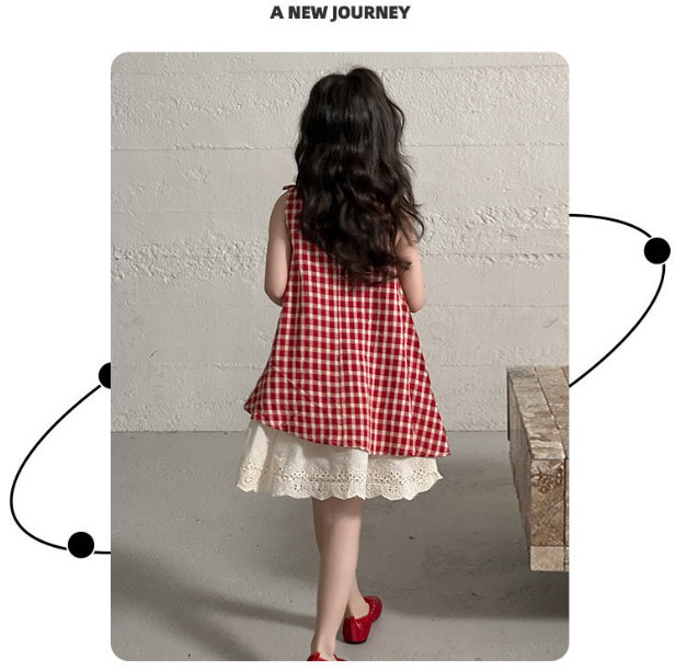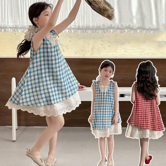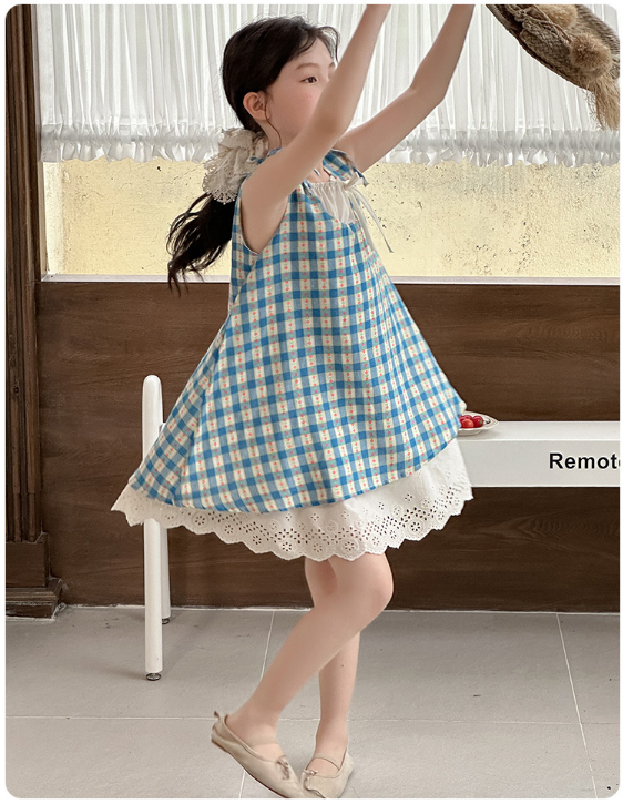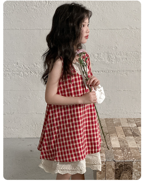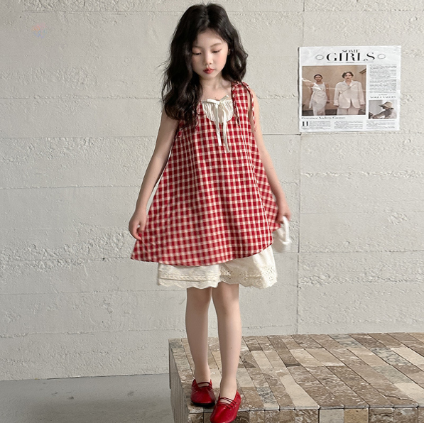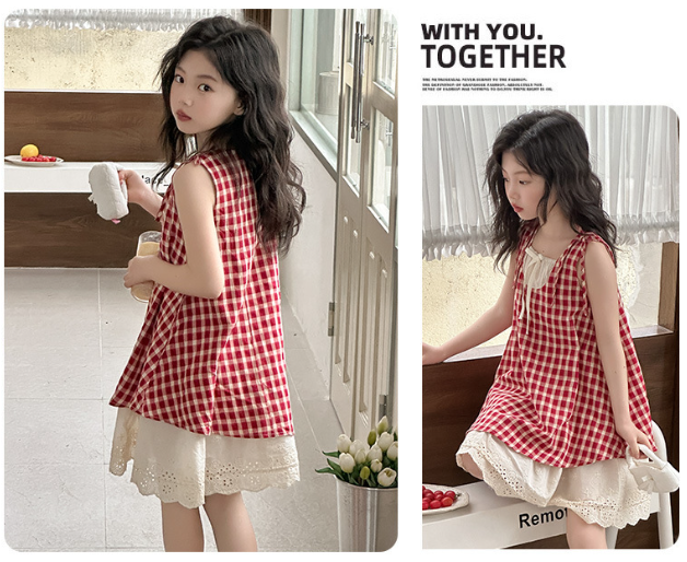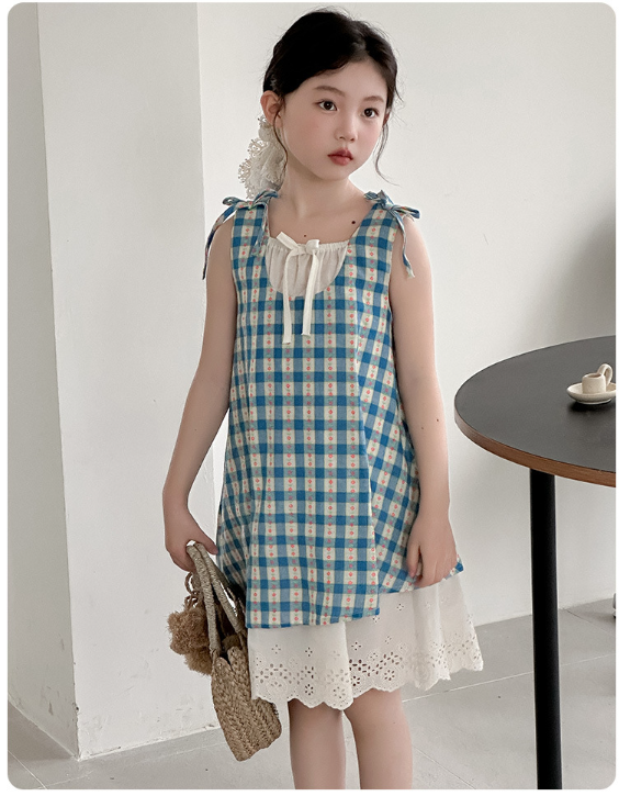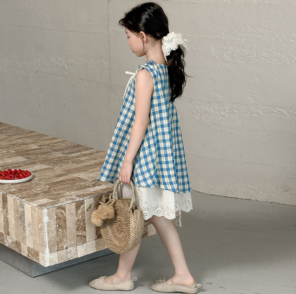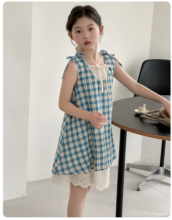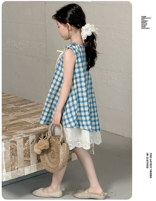 2025夏服新作韓国子供服 女の子 チェック柄ワンピース