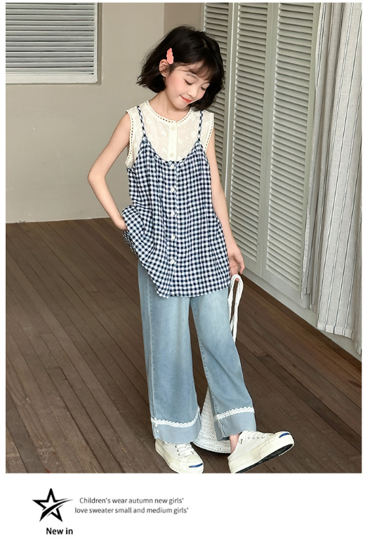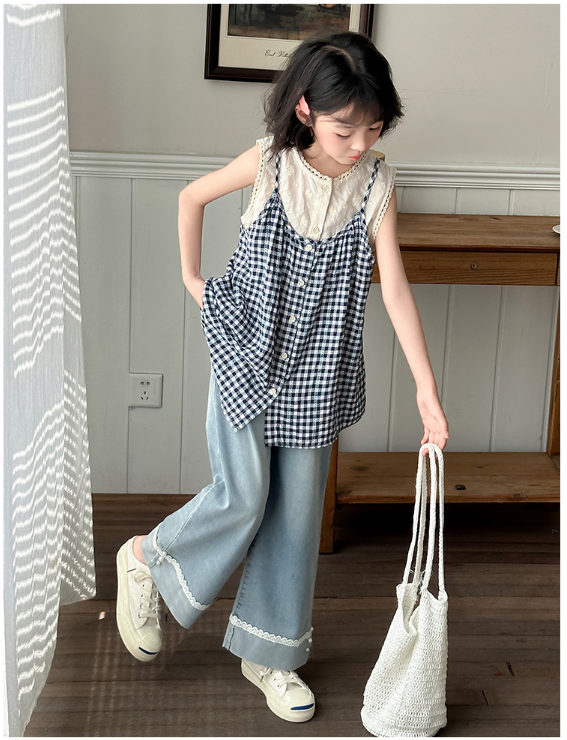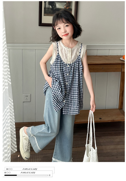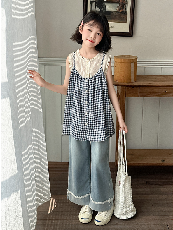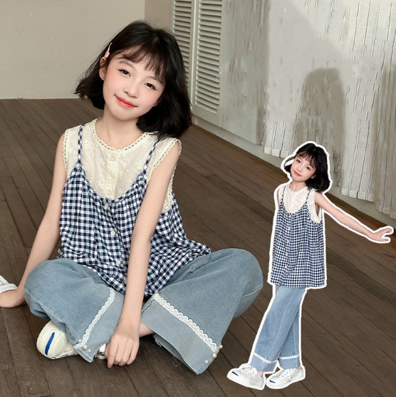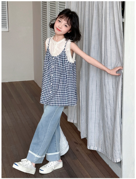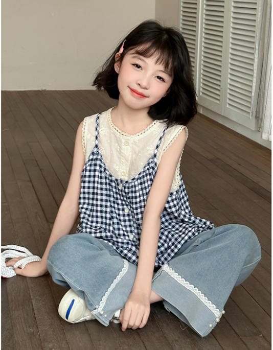 2025夏服新作韓国子供服 チェック柄 重ね着トップス