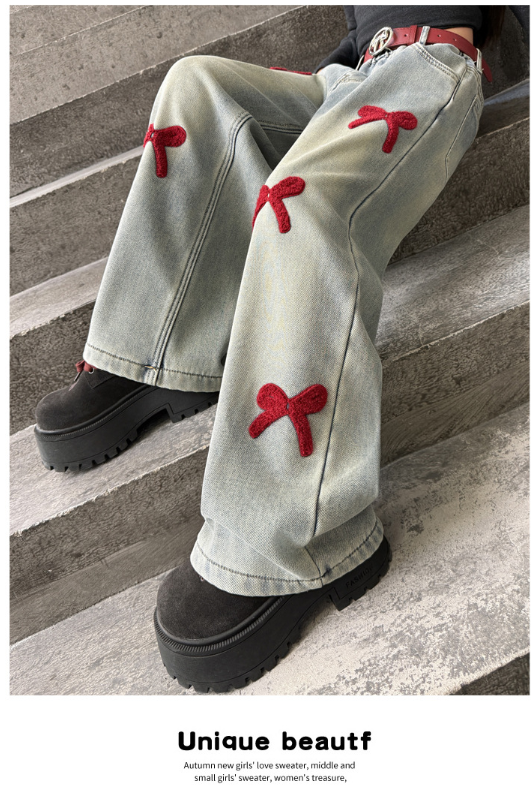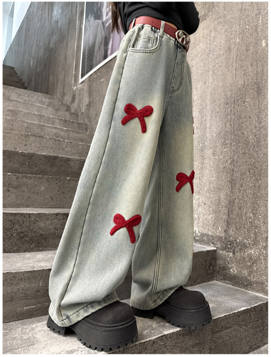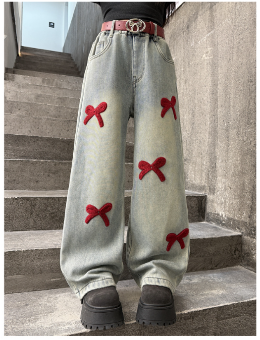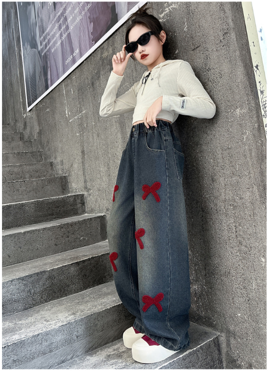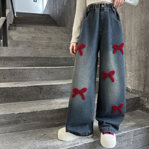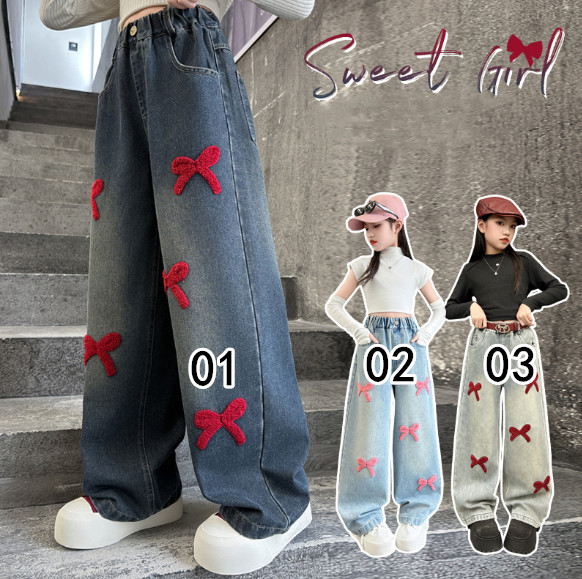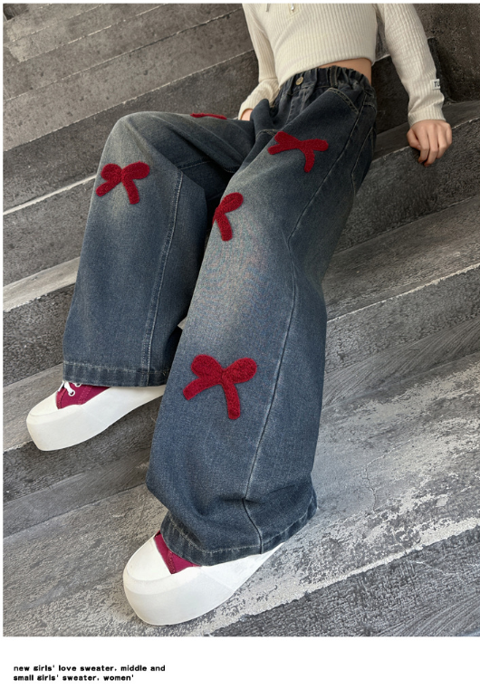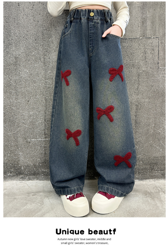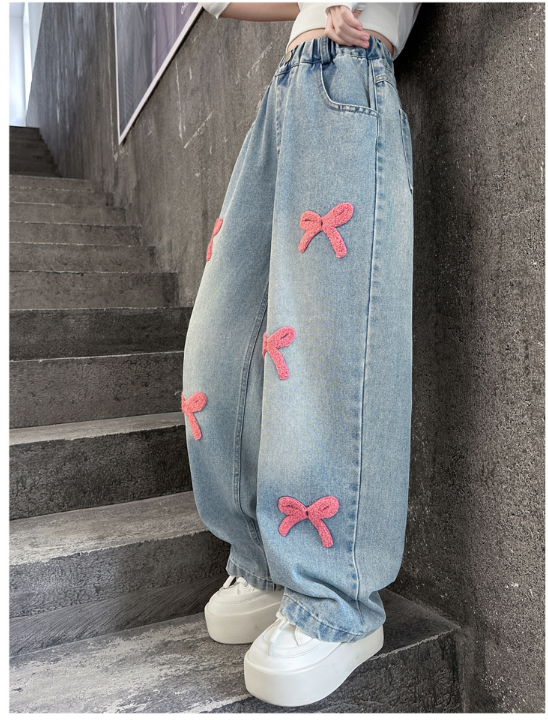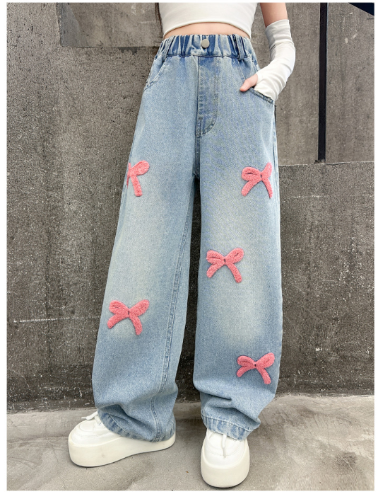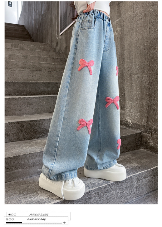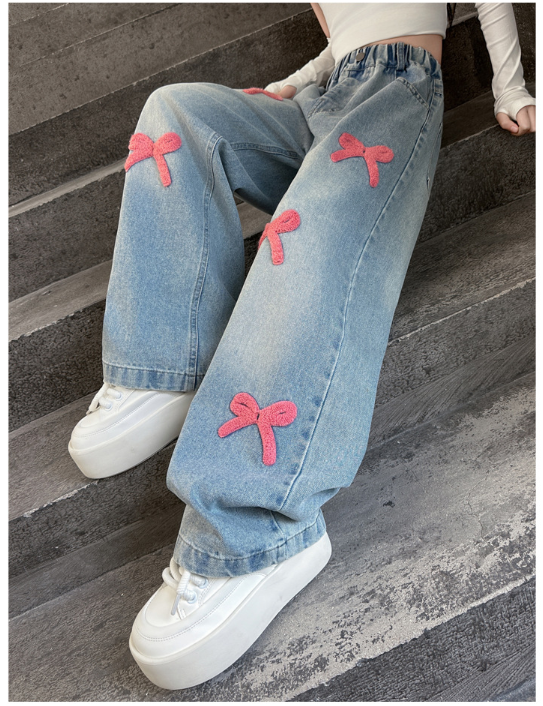 2025秋服新作韓国子供服 刺繍リボン デニムパンツ